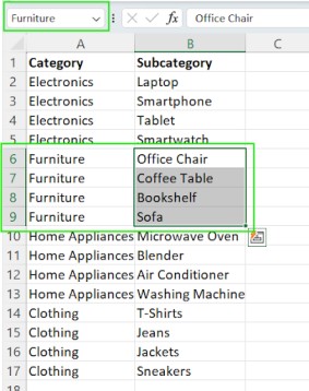 In the first drop-down menu, select the main category range. Use Data Validation > List and set the source from the ‘Category’ column range. This step should be similar to the one we have used before.