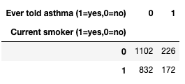 print("2x2 table (rows: non-smoker, smoker; cols: no asthma, asthma)")