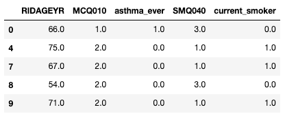 colnames=["Ever told asthma (1=yes,0=no)"]