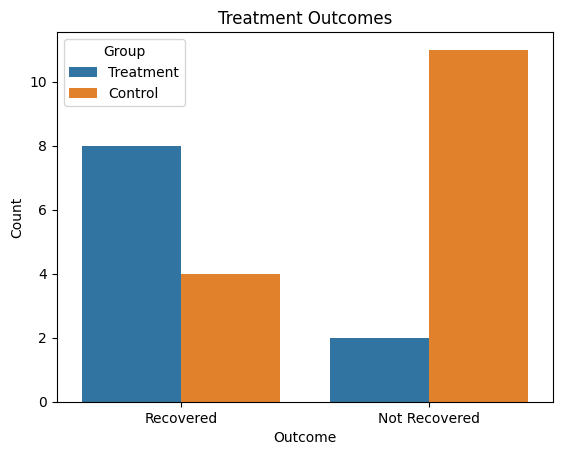 sns.barplot(data=df, x="Outcome", y="Count", hue="Group")