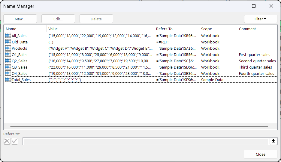 Select one or more names (Ctrl+Click for multiple selections), click Delete, and confirm. Any formula referencing deleted names immediately shows a #NAME? error.