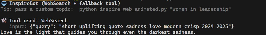 - InspireBot CLI: This project combines web search capabilities with a custom fallback tool for motivational quotes.