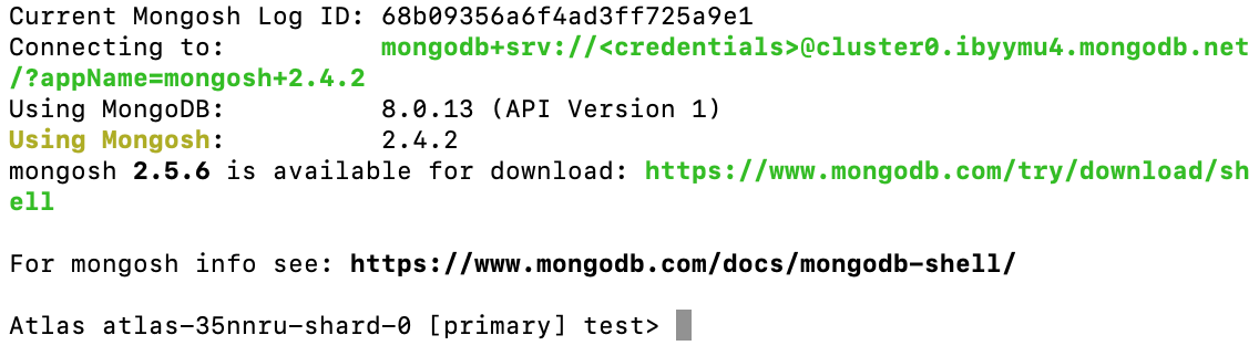 mongosh "mongodb+srv://<yourclusterhere>.mongodb.net/" --apiVersion 1 --username <yourusername>