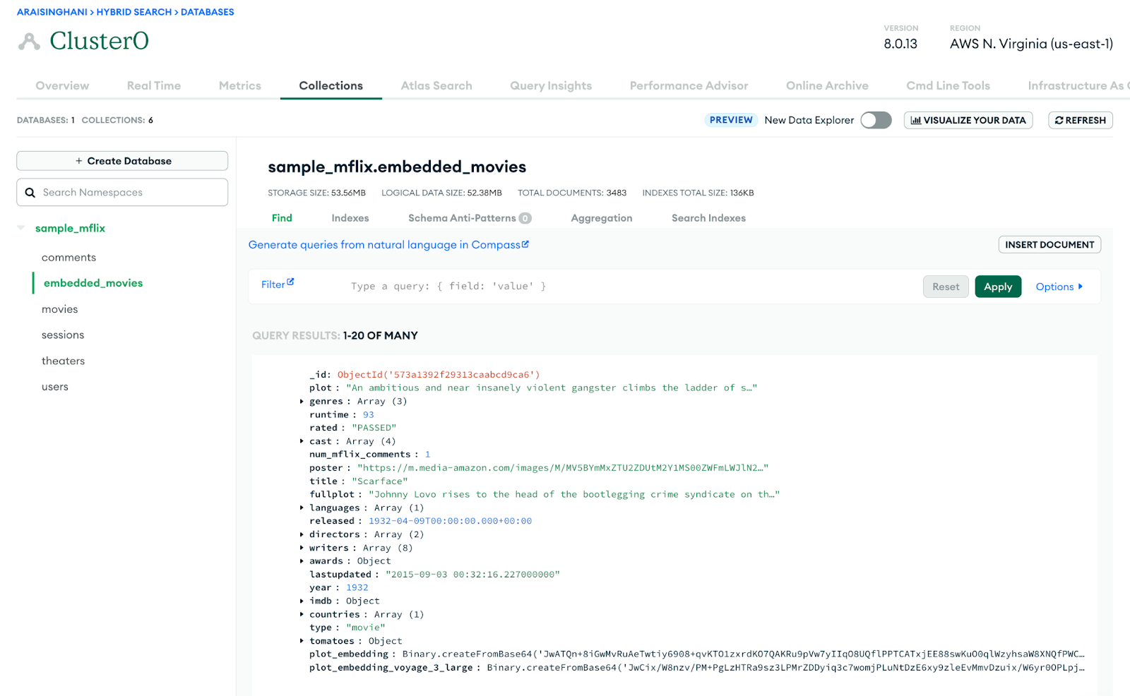 In this tutorial, we will be focused on the embedded movies collection in our sample_mflix database, and we will be following along with this $rankFusion hybrid search tutorial, with a handful of caveats.