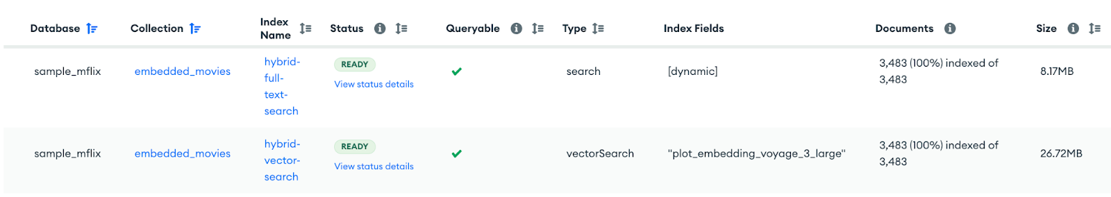 We can go ahead and create both the indexes we need for this tutorial. They are our vector index, and our full-text search index. Keep in mind that we are creating both these indexes on our embedded_movies collection.