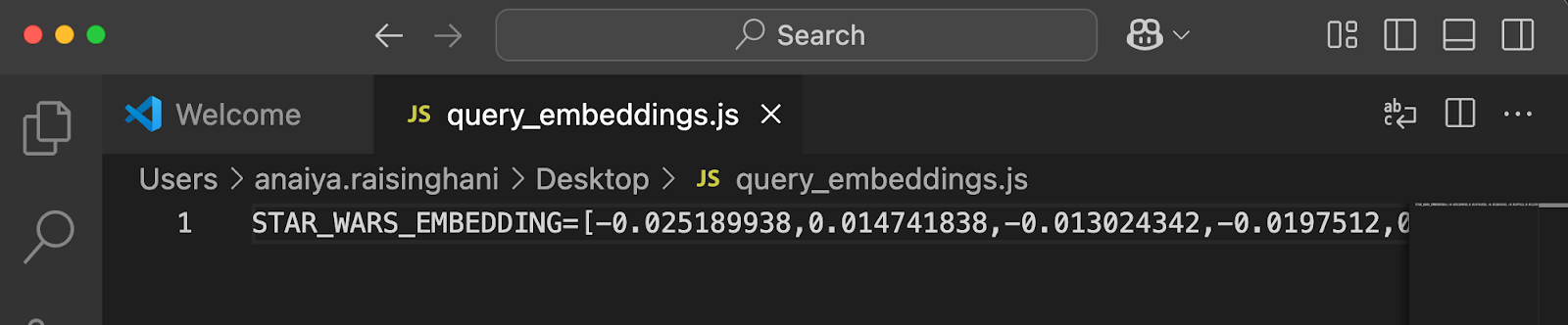 Following along with the tutorial, since we aren’t having to use any APIs, we can save all the embeddings we need into a separate file named query_embeddings.js.