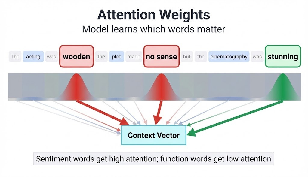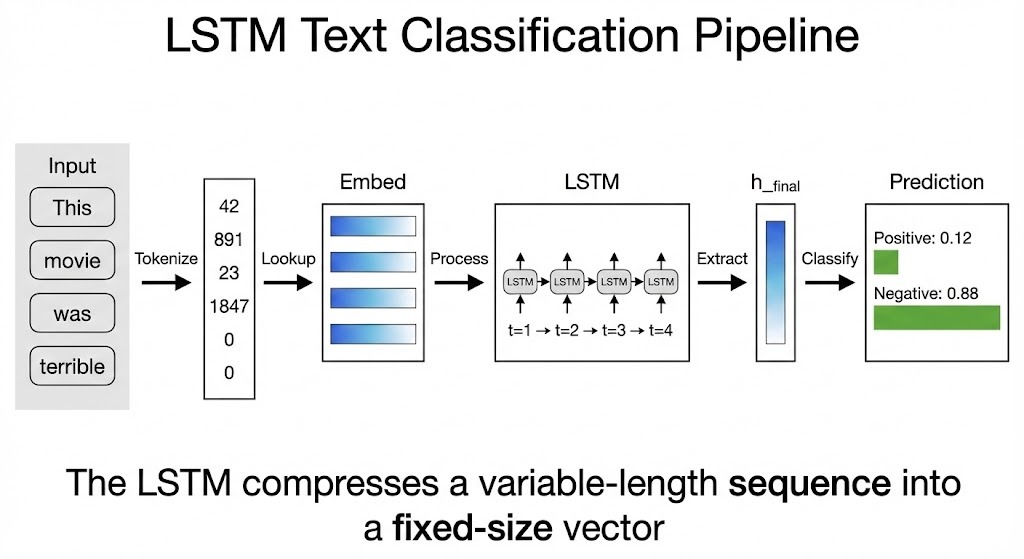 Random embedding initialization works, but pretrained embeddings like GloVe or Word2Vec give the model a head start. These embeddings encode semantic relationships learned from billions of words: "king" and "queen" end up near each other, as do "terrible" and "awful."