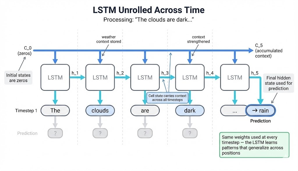To understand how LSTMs work, we'll trace a concrete example: processing the sequence "The clouds are dark..." to predict the next word. Each component makes more sense when you can see what it does to actual data.