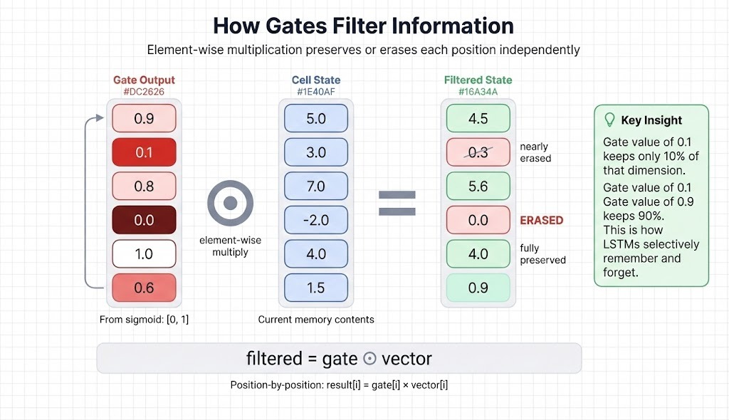 If a gate outputs 0.9 for position 1, that dimension keeps 90% of its value. If it outputs 0.0 for position 4, that dimension gets erased. When processing "dark" after "clouds are," the forget gate might output high values for dimensions storing noun/weather context and lower values for dimensions holding irrelevant earlier context.