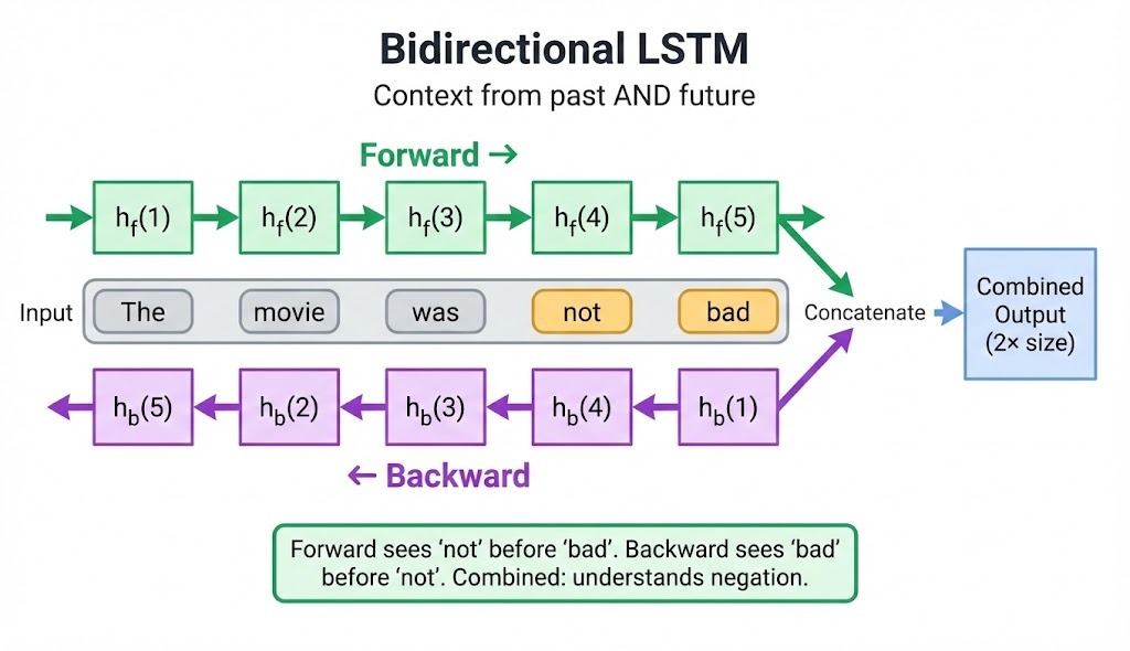 A bidirectional LSTM runs two passes over the sequence: one forward and one backward. This gives each position context from both directions, which helps when meaning depends on future tokens (like "not bad" where "not" needs to see "bad"). Use it for classification and tagging tasks where you have the full sequence at inference time, but avoid it for streaming applications.