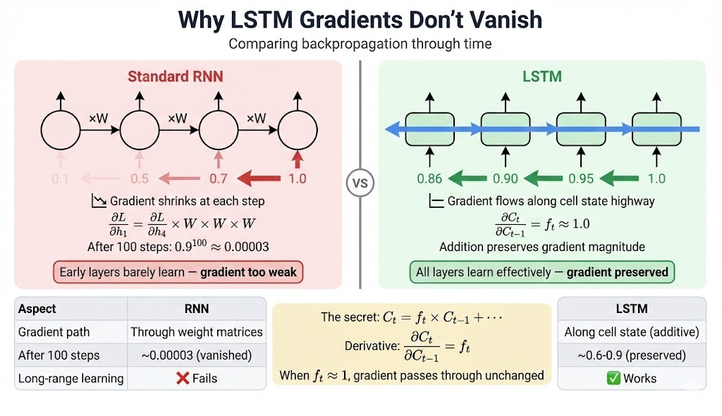 It's like making a photocopy of a photocopy. Do it a few times, and the copy looks fine. Do it fifty times, and you can barely read the text. RNNs hit this wall somewhere around 20-30 timesteps, which is why they struggle with longer sequences.