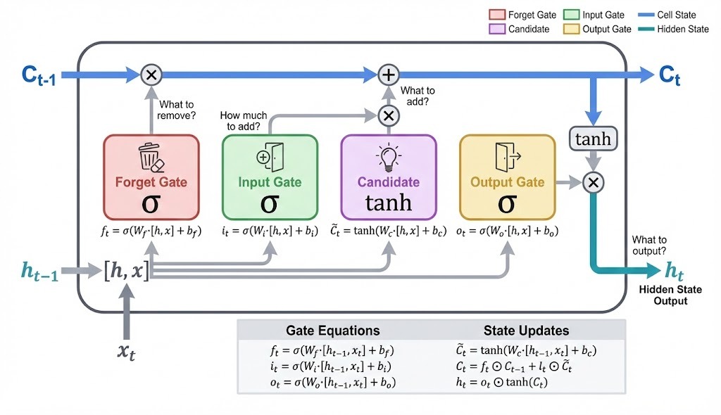 This gating mechanism is what separates LSTMs from vanilla RNNs. Instead of forcing all information through the same path, LSTMs can selectively preserve context across hundreds of timesteps. The next section breaks down exactly how these gates work and how they combine to update the cell state.