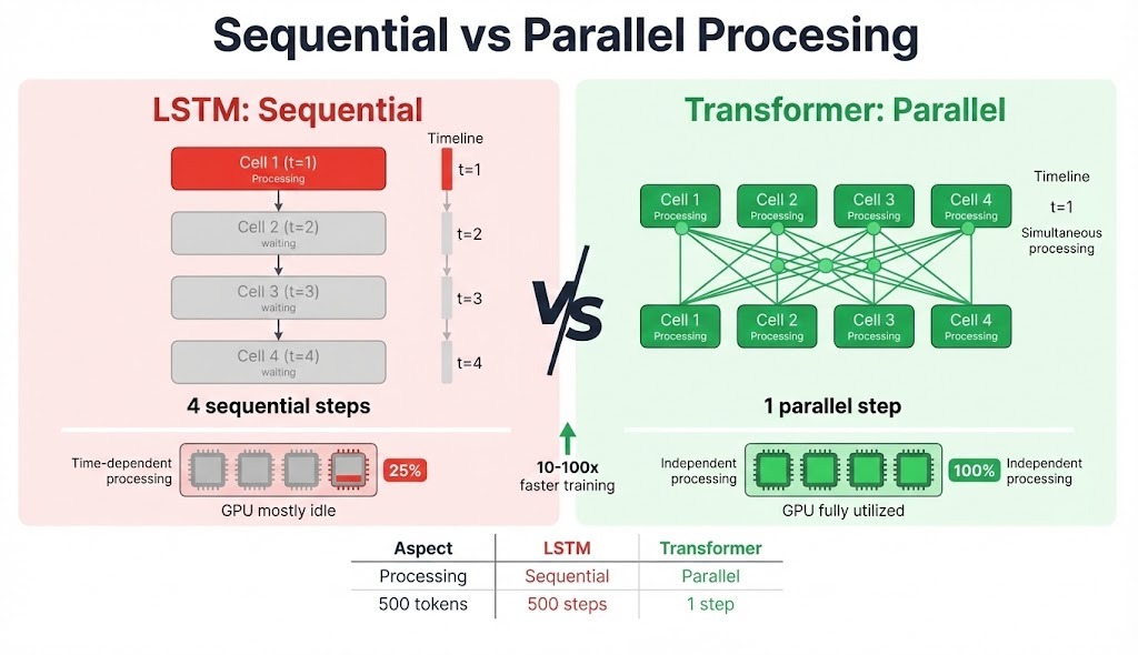 Transformers don't have this constraint. Self-attention computes relationships between all positions simultaneously, so the same 500-token sequence is processed in parallel. On modern hardware with large batch sizes, this translates to 10-100x training speedups.