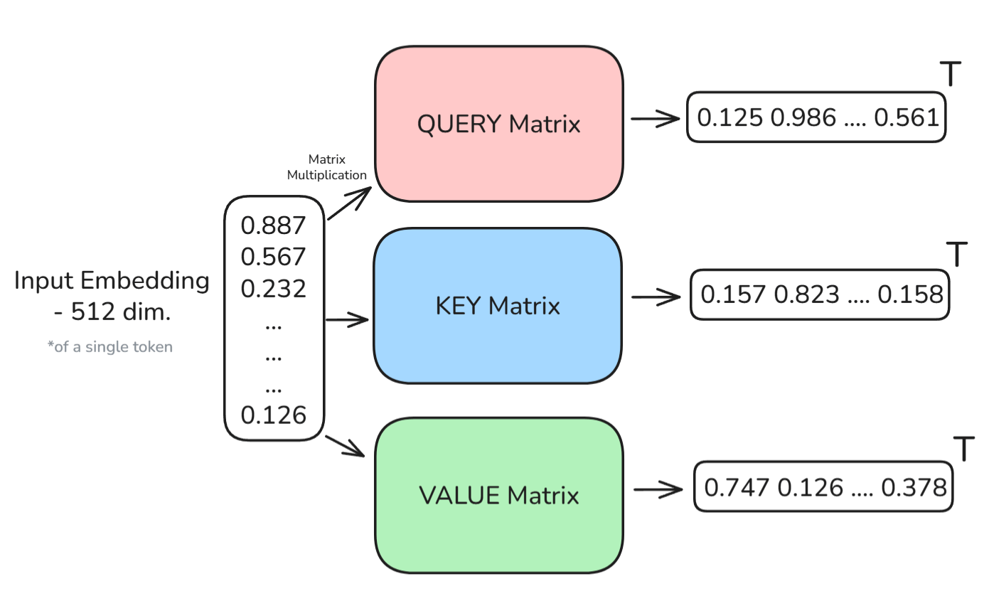 From this, each token can be represented by three new vectors. I have created the diagram below to help visualize this process: