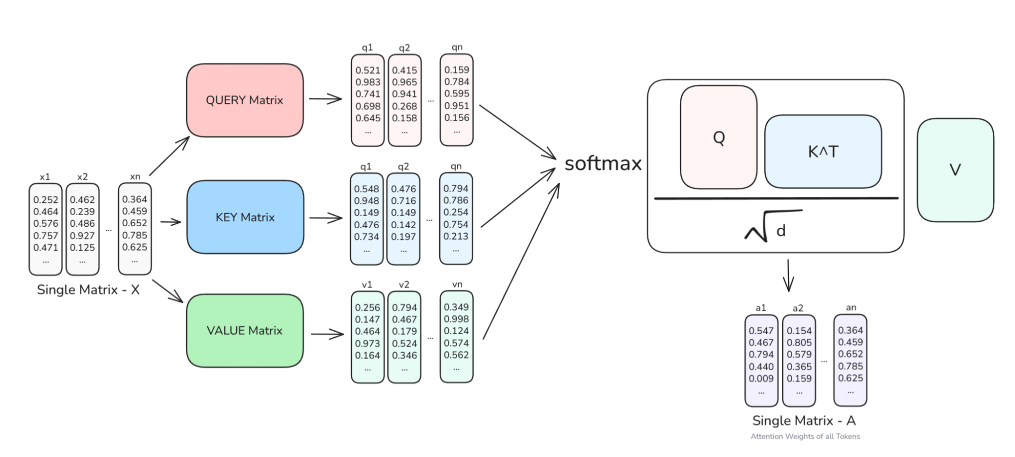 To help visualize things, take a look at the above diagram. You can see that the input matrix X is transformed to the respective Query, Ke, and Value matrices, and then the scaled dot-product attention formula is applied, to obtain the full enriched embedding vectors of all of the tokens in our input - A.