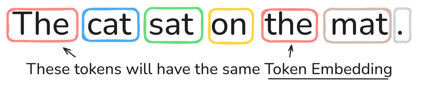 After, each of these unique token IDs are mapped to their respective token embedding using an embedding matrix. It is important to note that all of these token embeddings will be vectors of the same dimension; in our example, we are assuming 512.