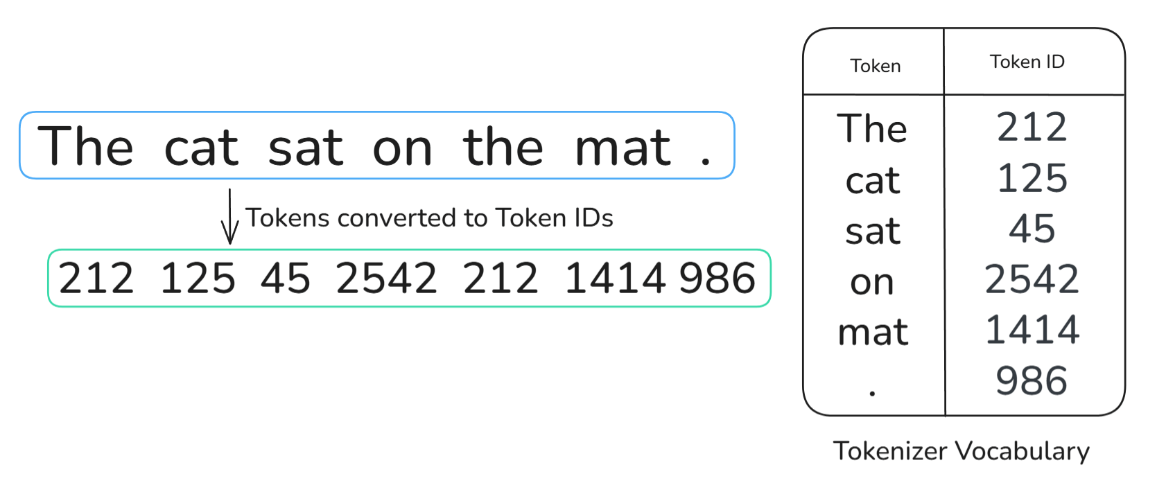 After tokenization, we use a tokenizer vocabulary to convert each token to its respective Token ID. The tokenizer vocabulary can be thought of as a database/table which holds all of the tokens that the model can identify and their respective Token ID.
