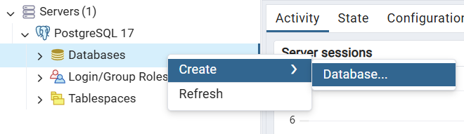 pgAdmin, right-click on "Databases" and select "Create > Database".