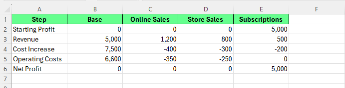 - In Column A, enter the category names. These represent the steps in your calculation.